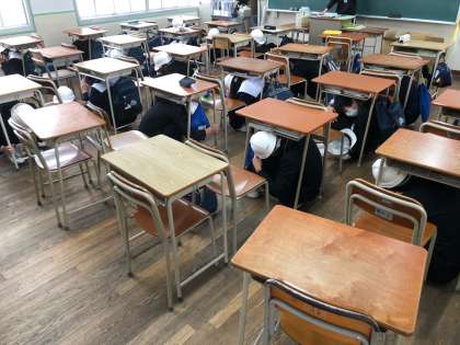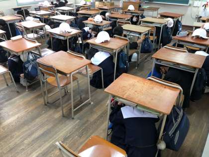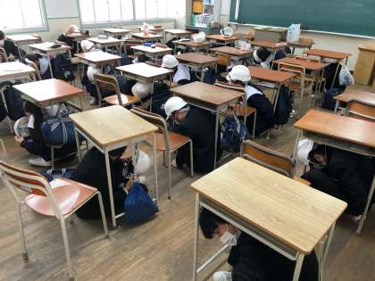 地震発生の想定で、机の下に身を隠しました。3年生の身体の大きな人は窮屈そうでした。