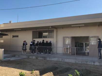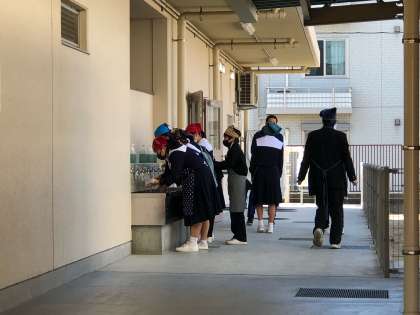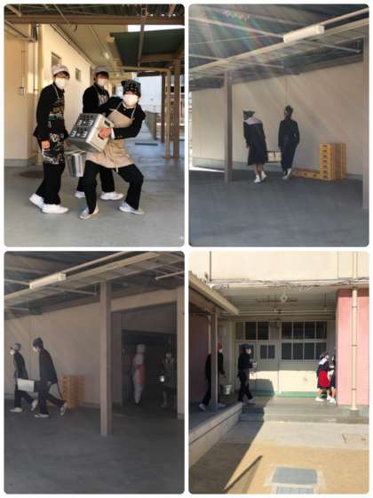 給食室に食缶や食器を取りに当番の人がやってきました。