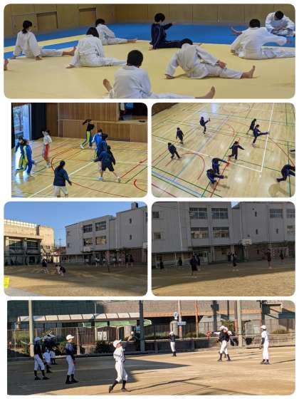 放課後の部活動。柔道部、野球部、女子バレー部、男子バレー部、バドミントン部、女子バスケット部の様子です。