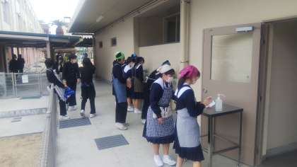 上 給食室に入る前の手洗い場にて