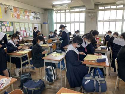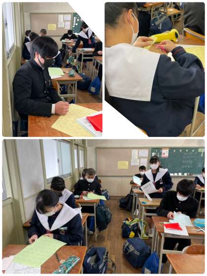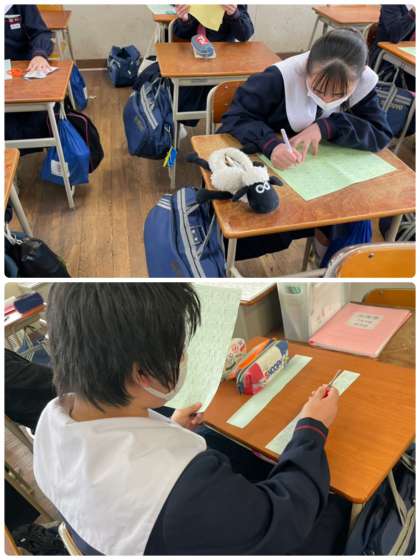 6時間目2年生では、昨日に引き続いて、いいとこ探しの取り組みを行っています。今日は、クラスメイトに向けて書いたコメントを渡して行き、自分の台紙に入りつける作業をしています。