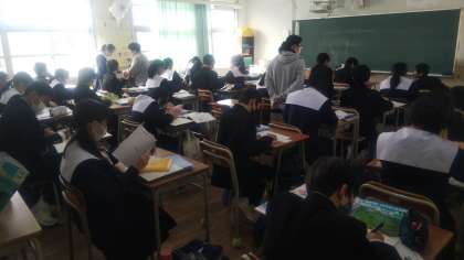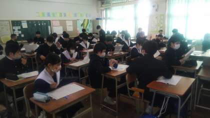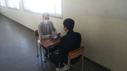 C-NETのマイク先生と会話テストを行っています。みんな少し緊張しています。