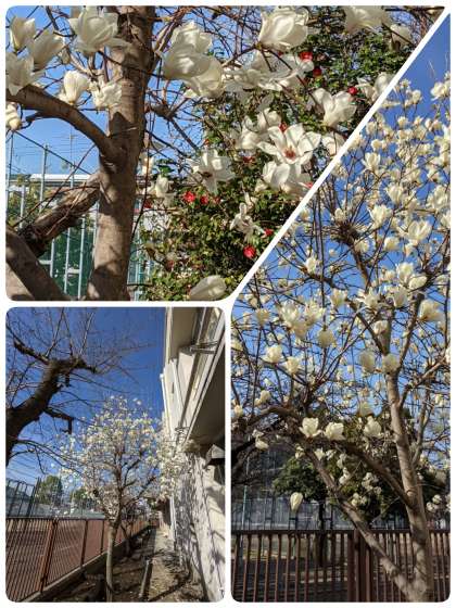 校内のハクモクレンが満開です。赤い花は椿です。