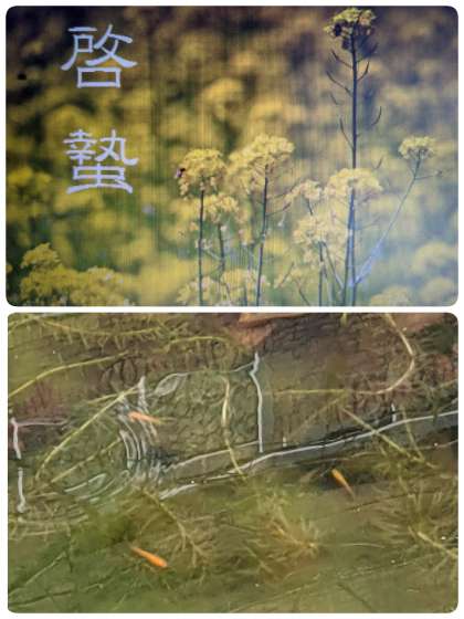 二十四節気の啓蟄です。大地が温まり、冬眠していた虫がはい出てくる頃です。池のメダカも水面に上がって来ました。