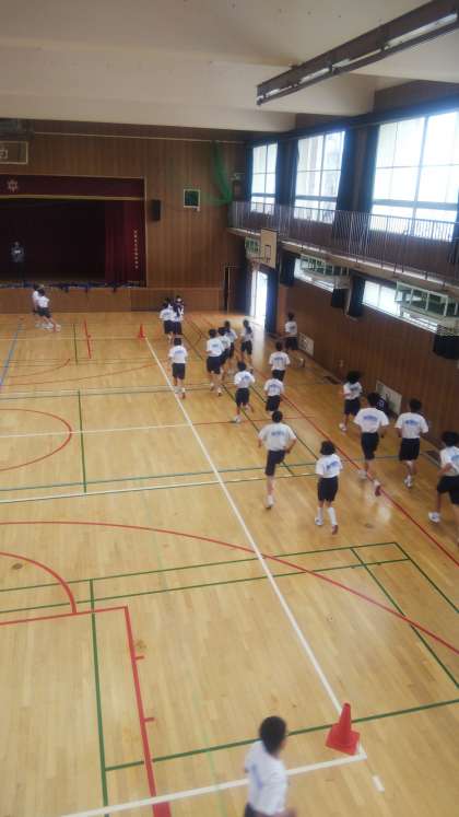 持久走のトレーニングを体育館で行っています。