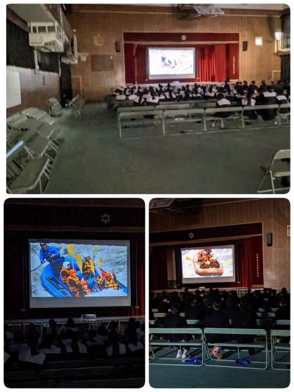予行の後、3年間の想い出のフォトを鑑賞しています。