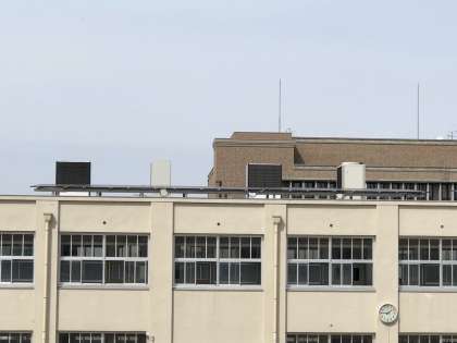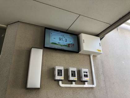 北校舎の屋上に太陽光パネルが設置されました。そこで発電された電力が、体育館の入り口付近に設置されたモニターに表示されます。