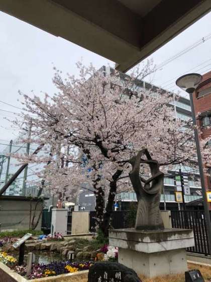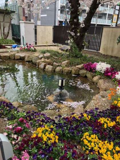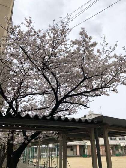 今日は、校内の桜も雨に打たれ、散り始めています。池の水面に桜の花びらが浮いています。
