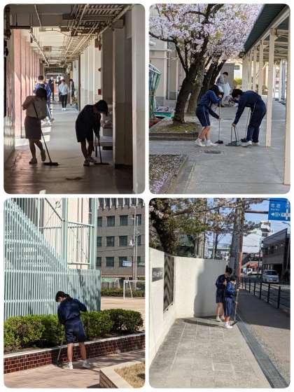 新2年生は式場の外の掃除をしてくれています。桜の花びらが舞って大変です。
