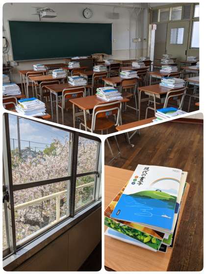 1年生の入学を待つ教室です。窓の外は桜が満開です。