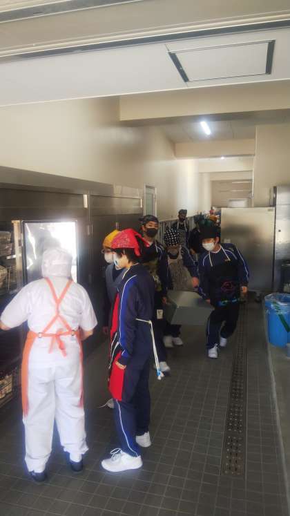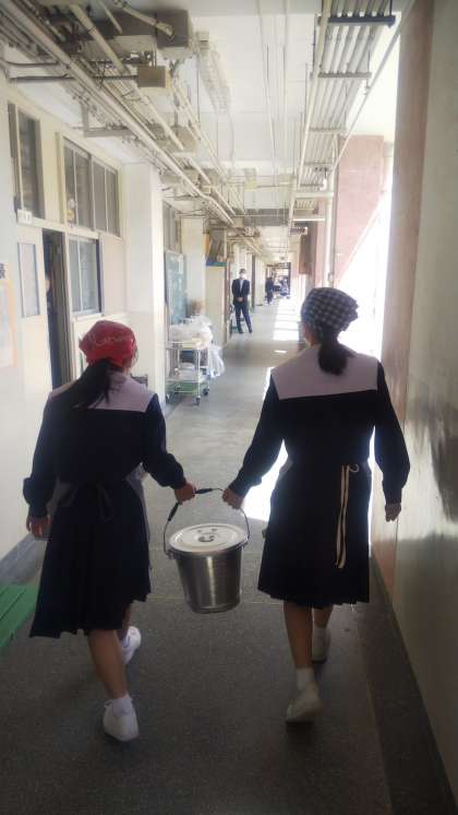給食係さんが教室へ給食を届けます。