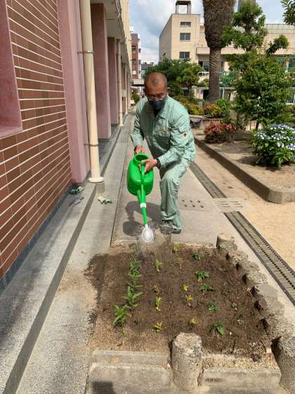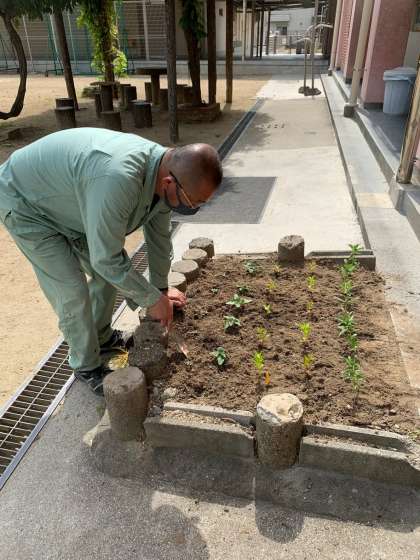 平野区役所安全安心まちづくり課より提供いただいた花の苗を、管理作業員さんに植えていただきました!