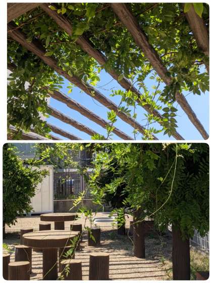 新しい藤棚も葉が茂り、日陰ができつつあリます。