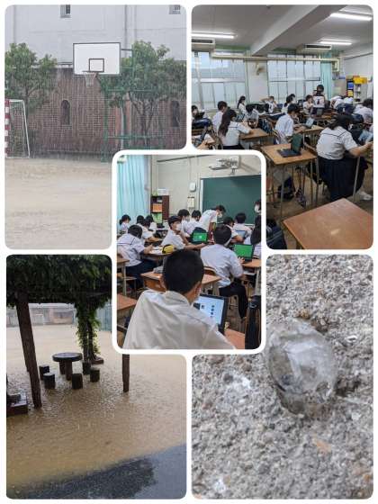 学校のグランドは水が溜まっていますが、全員、元気にしています。
