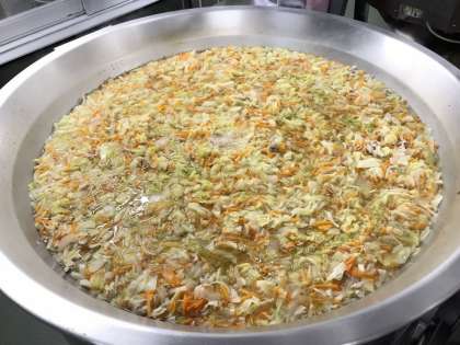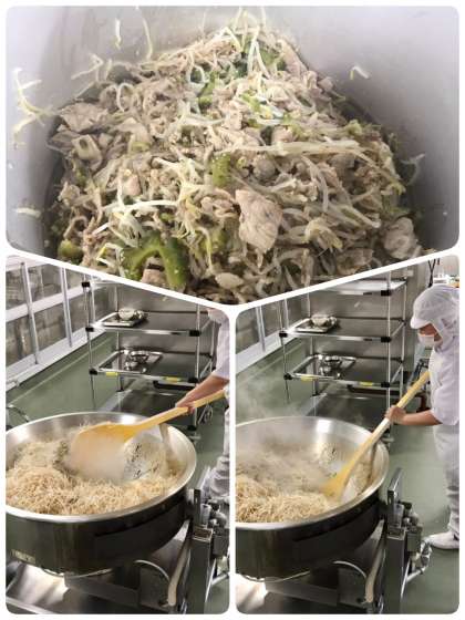 激暑の厨房で調理員さんがゴーヤをチャンプルしていますm(_ _)m