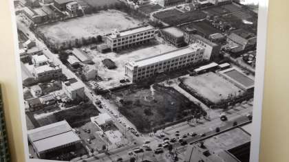 今、東京オリンピック(2021)が開催されていますが、前回の東京オリンピック時代(1964)の、摂陽中学校の外観です。平野区役所上空からの写真です。