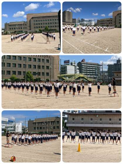 今月末の体育大会に向けての練習が始まっています。コロナ対策と熱中症対策をしての授業です。