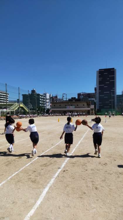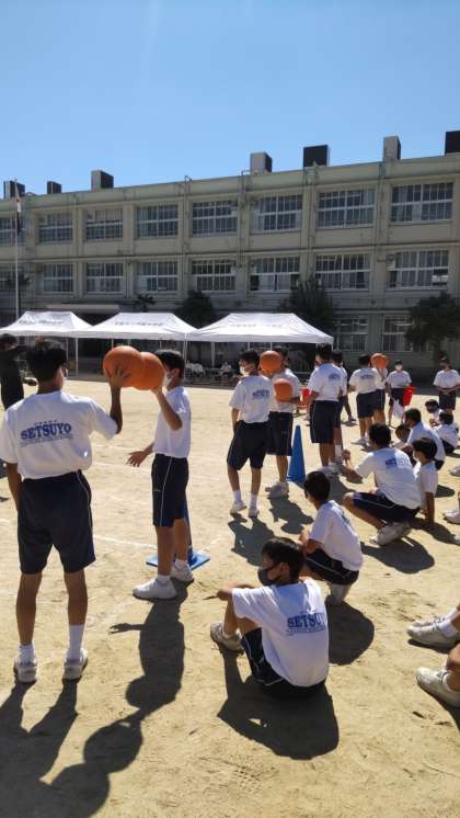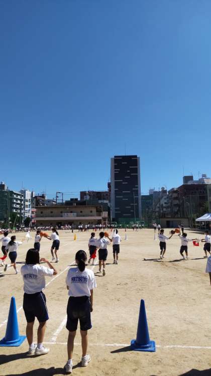 2人一組でお互いのボールを押し当てながらゴールを目指します