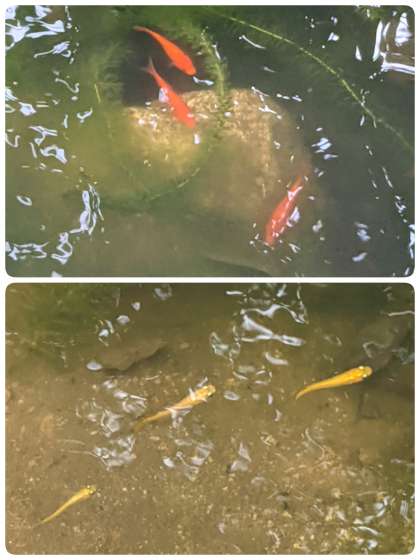 今日も快晴です。 池の金魚とメダカです。