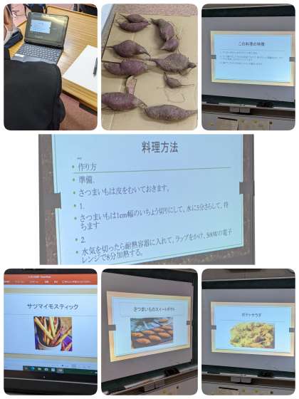 特別支援学級の授業です。収穫したさつまいもを使っての料理について、パワーポイントを使って資料を作成しプレゼンテーションをしています。