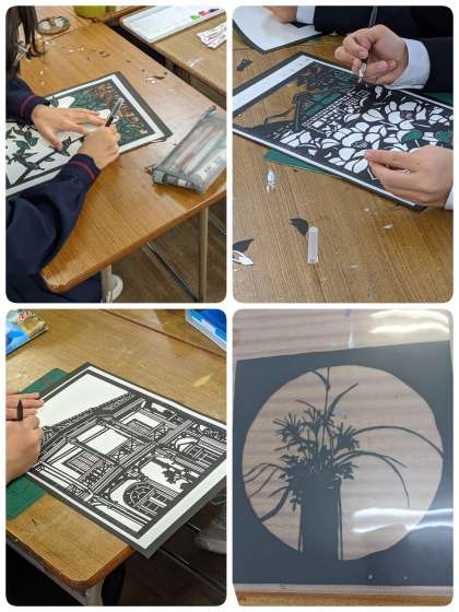 版画ができた人は、切り絵の制作に取り組んでいます。
