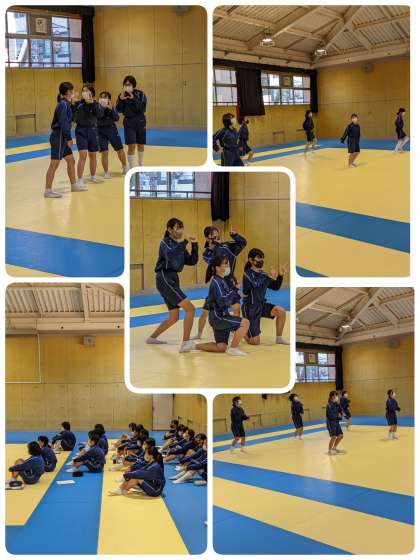 2年生の女子体育の授業です。 グループでダンスを創作し、その発表会。 チームワーク力と表現力を競っています。