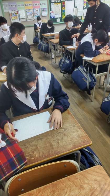 教室では、卒業文集を下書きしています。