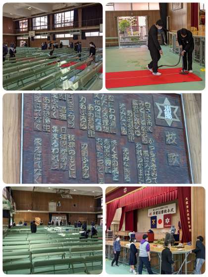 卒業式のため、会場設営と清掃をしています。