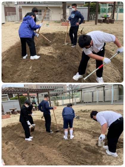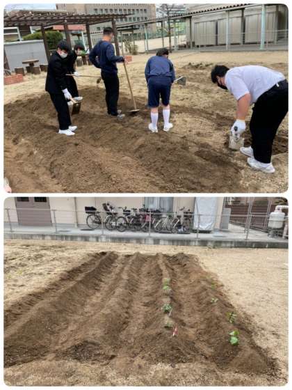 みんなで協力し、特別支援学級の畑にトマト、きゅうり、なすなどの苗を植えました。