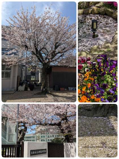 桜の花びらが舞い、池の水面にも浮かんでいます。