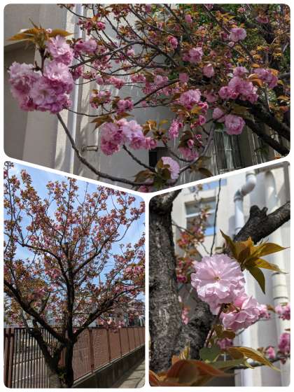 校舎の南に八重桜があります。 きれいに咲いています。