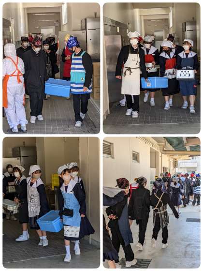 給食室から教室へ運んでいます。