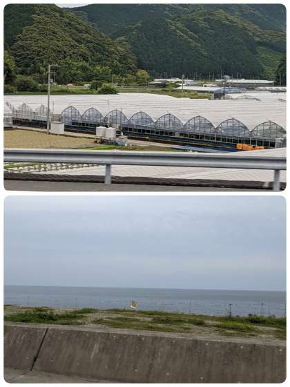 ビニールハウスが多い山間部を抜けて、太平洋沿いヘ。桂浜とお土産購入ヘ向かっています。