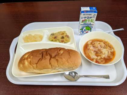 豆乳マカロニグラタン[米粉] トマトスープ 洋なし パン 牛乳