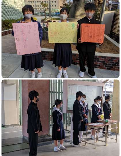 生徒会と風紀委員の皆さんです。 生徒会は、書き損じハガキ・切手・テレホンカードの寄付を集めています。