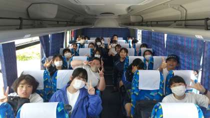 昼食後(1枚目は昼食前の写真です)、各体験場所に向かうバスに乗り換えました。バス内の写真は「アップルパイ+リンゴ摘果」のグループです。