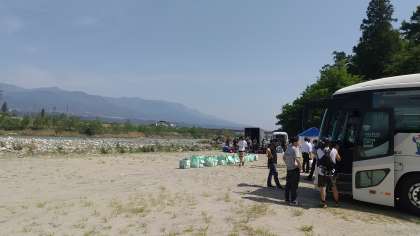 ホテルを出発(退館式ではホテルの方から「過去1番くらいの元気なあいさつ」と褒めていただきました!)、バスに乗車、天竜川ラフティング体験スタート地点に到着しました。