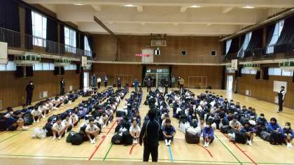 先生からの連絡、諸注意を聞いています。実行委員の皆さん、いろんな役割ごくろうさまでした。みんなの協力もあってとてもいい修学旅行になりましたね。