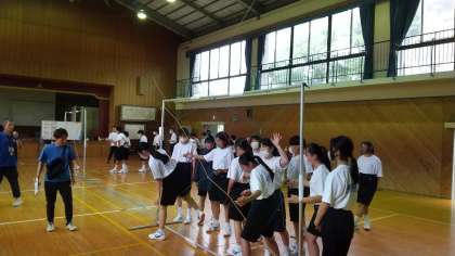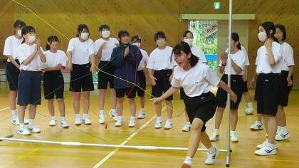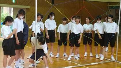 ひもについた鈴の音を鳴らさないようにくぐり抜けます。見た目以上に難しく周りの協力が必要となります。