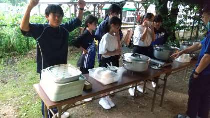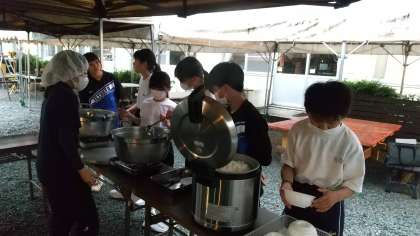 夕食の時間になりました。メニューは豚丼です。食材係、食器係が準備してくれました。