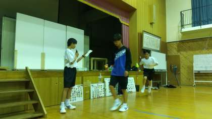 次に「ボール運び競争」です。体育委員の進行で行われました。写真は見本を見せているところです。