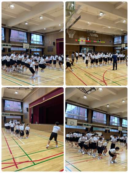 1年生は本日1,2時間目に体育館で体育大会に向けた学年練習を行いました。