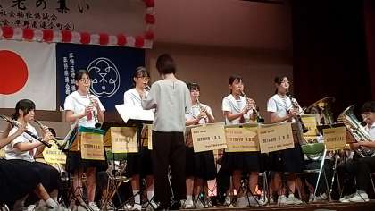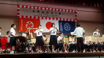 9月10日(日)、平野区民ホールで「平野南敬老の集い」が開催され、アトラクションの部に吹奏楽部が出演しました。