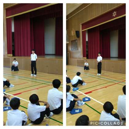本日の集会では、文芸委員長から「文化発表会」についての取り組みや2分前着席を自分から意識して行動しようと話がありました。「文化発表会」は来月に控えているので、合唱の練習や作品の製作など頑張ってほしいです。