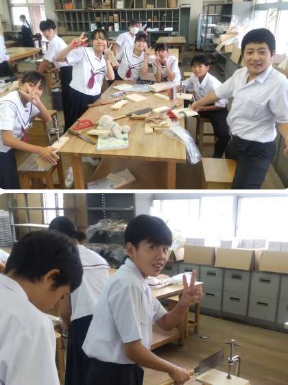 4組の技術です! 木材をノコギリで切り分け、やすりで磨いています(^^)