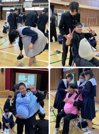 重りをまとって、妊婦体験もしました♪ 妊婦さんの大変さも実感できたようです^_^