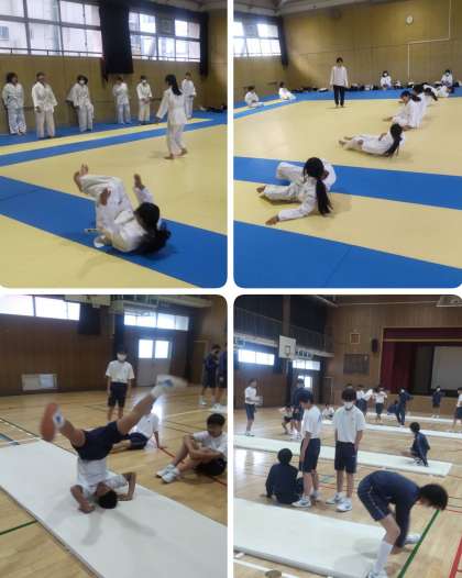 体育の様子です! 女子は柔道で受け身の練習を、 男子はマット運動で開脚後転を練習しています^_^