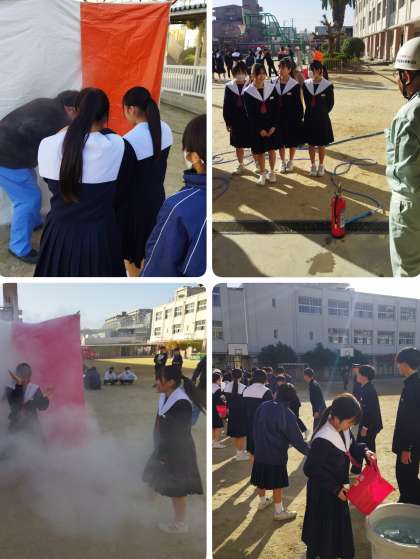 2年生は中庭にて、水消火器体験、水バケツ訓練、煙体験をしました(*^^*)