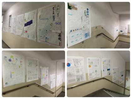 南館の1階から2階をつなぐ階段や2階のフロアに1〜4組の各班で制作した大和川について調べてまとめた壁新聞を掲示しています。