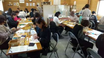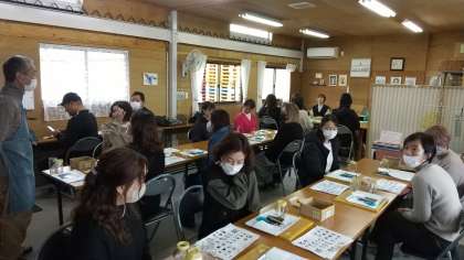 近江八幡市にあるガラス工房でサンドブラスト体験をしました。ビンやグラスの模様を切り絵の要領で思い思いに作成しました。砂が吹き付けられる出来上がりが楽しみです。